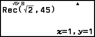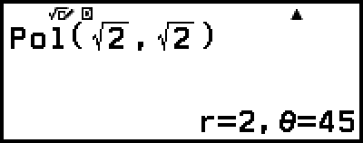 Example 2: To convert polar coordinates (√2, 45°) to rectangular coordinates (Input/Output: MathI/MathO, Angle Unit: Degree)