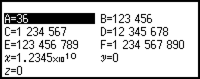 displays a screen that shows the values currently stored to variables A, B, C, D, E, F, x, y, and z. On this screen, values are always displayed using the "Norm 1" Number Format. To close the screen, press