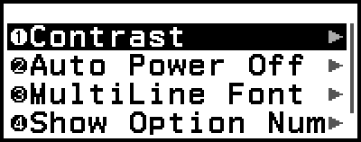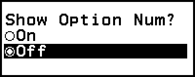 Option Numbers are displayed when "On" is selected for the Show Option Num setting on the SETTINGS menu and not displayed when "Off" is selected. The default setting is On. Note that menu operations you execute by pressing number and symbol keys remain in effect even when "Off" is selected for the Show Option Num setting.