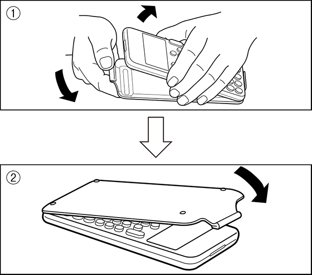 Before using the calculator, remove the front cover (①) and attach it to the back (②).