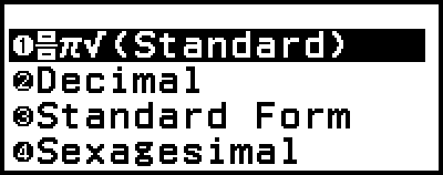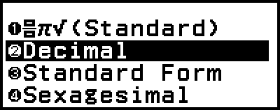 Standard is a format that displays a calculation result in a form that includes a fraction, √ , or π when possible. Decimal is a format that displays the calculation result as a decimal value.