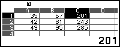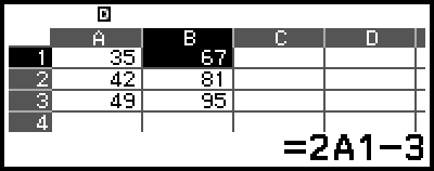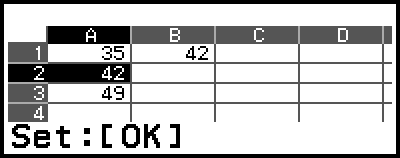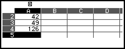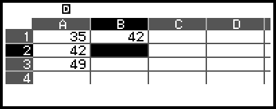 On the spreadsheet screen, you can store the value in a cell to a variable. For example, performing the following operation while the screen in step 3 is displayed will store 42 (calculation result of the formula input into cell B1) to variable A: