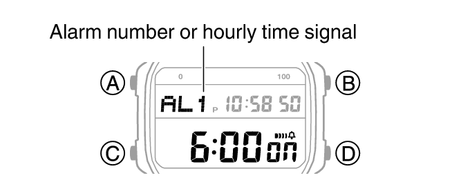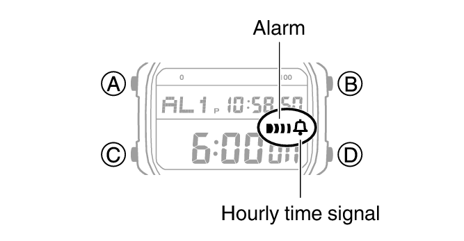 Press (A) to turn off the displayed alarm or the hourly time signal.