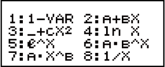 Mostrar el submenú de comandos Regr para cálculos de regresión • Para obtener más información, consulte "Comandos cuando se selecciona el cálculo de regresión lineal (A+BX)" y "Comandos cuando se selecciona el cálculo de regresión cuadrática (_+CX2)". |