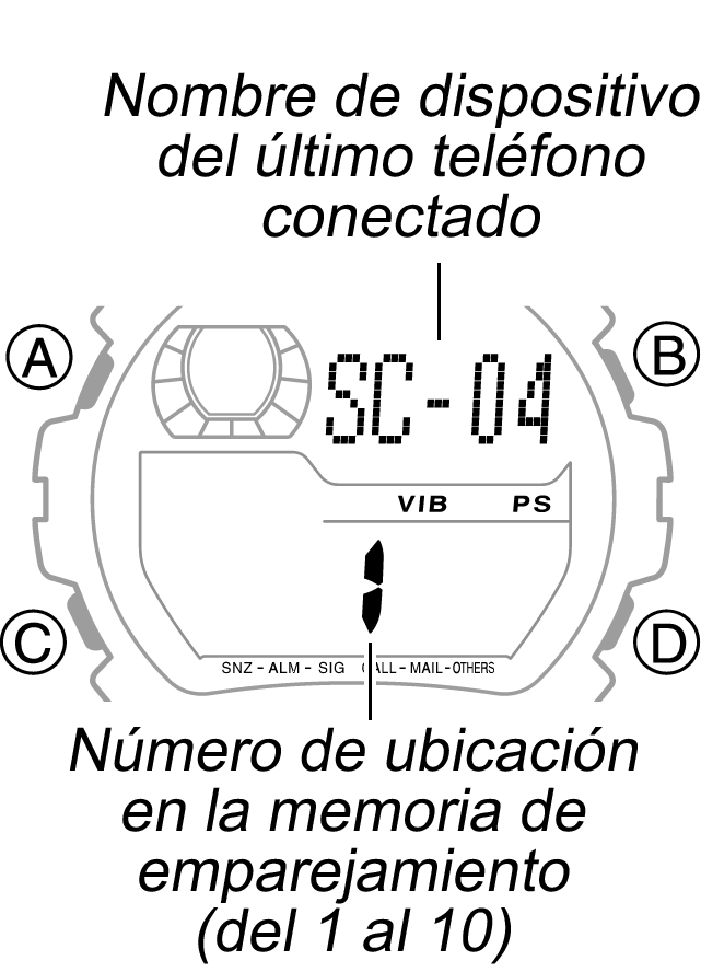 - En el modo de indicación de la hora, mantenga pulsado el botón B durante unos dos segundos hasta que aparezca la pantalla que se muestra a continuación.
