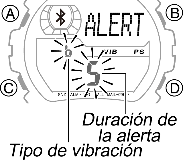 Cada pulsación del botón B cambia los ajustes de tipo de vibración en orden [A], [B], [C]. Después de cambiar estos ajustes, el reloj realizará una vibración de demostración según los cambios realizados.b. Visualización de animación activada/desactivada b.