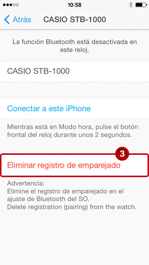 junto a "CASIO STB-1000" y, a continuación, toque el texto "Omitir dispositivo".De esta forma, "CASIO STB-1000" desaparecerá de la pantalla, lo cual indica que se ha borrado la información de emparejamiento del teléfono.