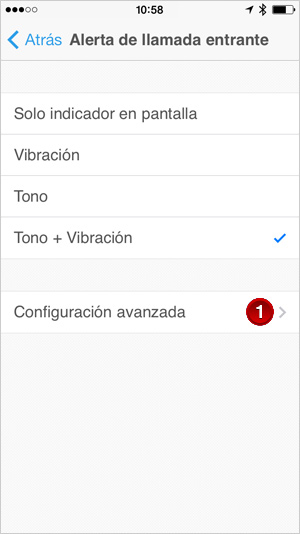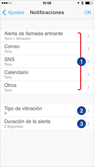 Solo indicador en pantalla, Vibración, Tono y Tono + Vibración. - * Los ajustes