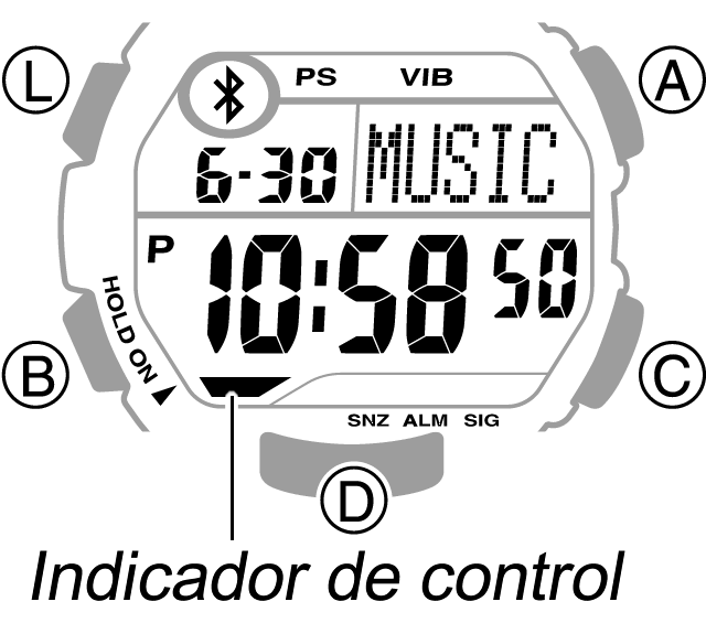 - Cuando aparece el indicador de control, el reloj se encuentra en el modo de control. En este caso, mantenga pulsado el botón B durante aproximadamente tres segundos para salir del modo de control y, a continuación, desactive la función Bluetooth (el icono de Bluetooth desaparece).