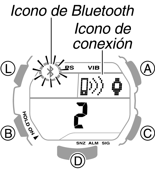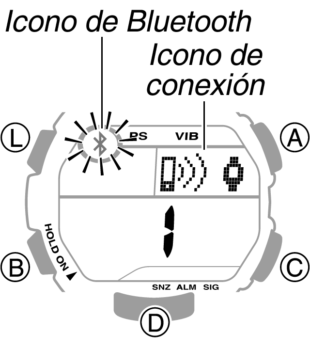 - Si el icono de Bluetooth se muestra en el reloj, entre en el modo de indicación de hora y, a continuación, mantenga pulsado el botón D durante aproximadamente dos segundos hasta que desaparezca el icono.