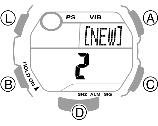 - Con el reloj en el modo de indicación de hora, mantenga pulsado el botón D durante aproximadamente tres segundos.