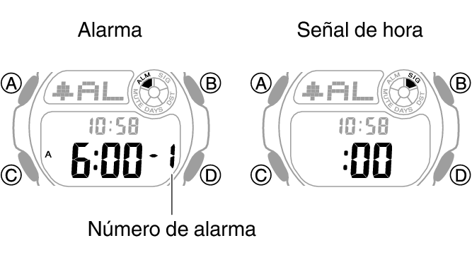 Pulse (D) para desplazarse a través de las pantallas de número de alarma (de [1] a [5]) y de señal de hora hasta que aparezca la pantalla que desea configurar.