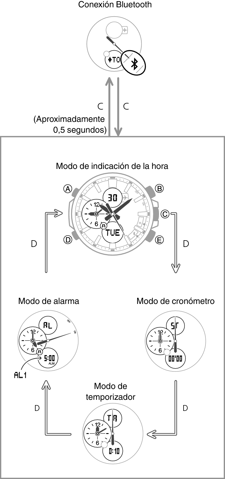 Utilice el botón (D) para navegar por los distintos modos. Mantenga pulsado (D) durante un par de segundos para acceder al modo de indicación de la hora. Para conectar con un teléfono, mantenga pulsado (C) durante aproximadamente medio segundo.
