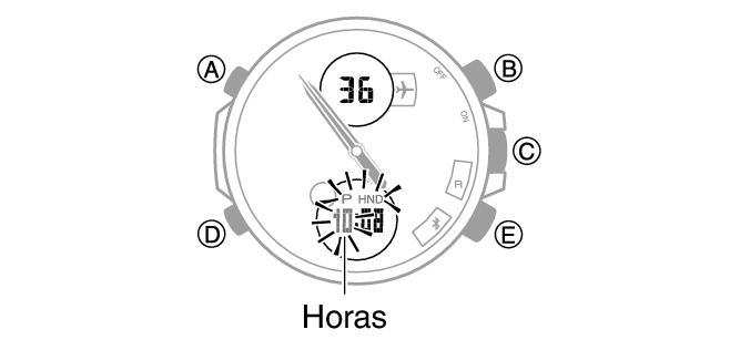 4.Pulse (D) para que el ajuste de hora parpadee.