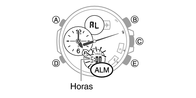 Botones (B) y (E): se usan para cambiar los dígitos seleccionados (horas o minutos).