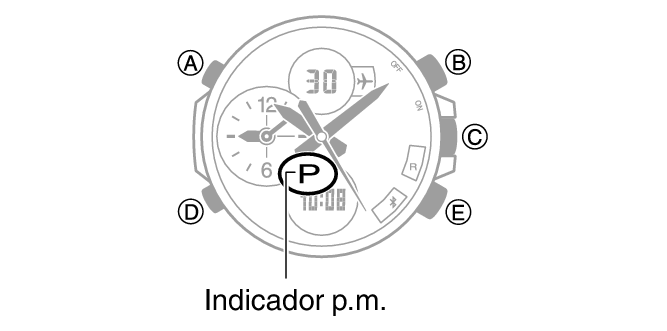 3.Pulse (E) para cambiar el ajuste entre [12H] (indicador de 12 horas) y [24H] (indicador de 24 horas).