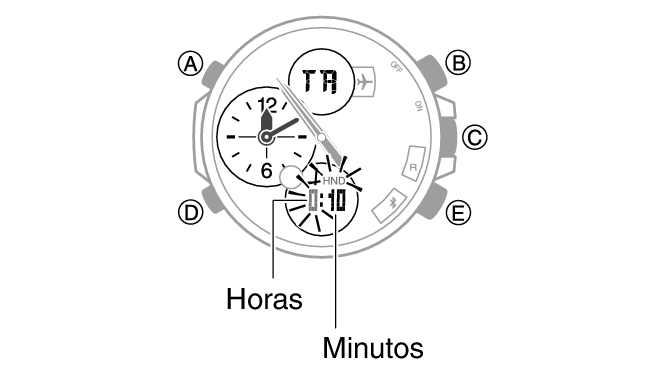 Botones (B) y (E): Cambia el parpadeo de los dígitos de las horas y los minutos.