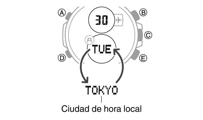 En el modo de indicación de la hora, puede realizar la siguiente operación para cambiar el contenido de las pantallas digitales.