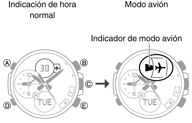 Cuando esté en un hospital, en un avión o en cualquier otra zona donde el uso de las ondas de radio no esté permitido, mantenga pulsado el botón (D) del reloj durante unos cinco segundos para acceder al modo avión.
