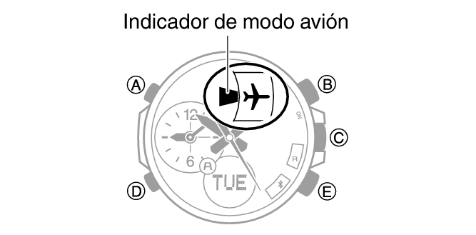 - Cada vez que se mantiene pulsado el botón (D) durante unos cinco segundos, el reloj accede o sale del modo avión.