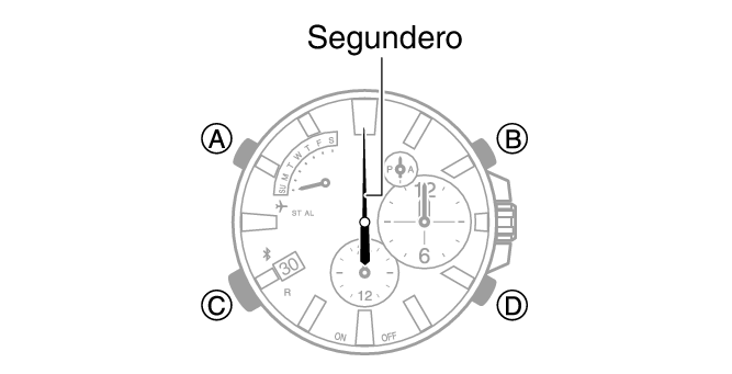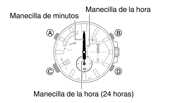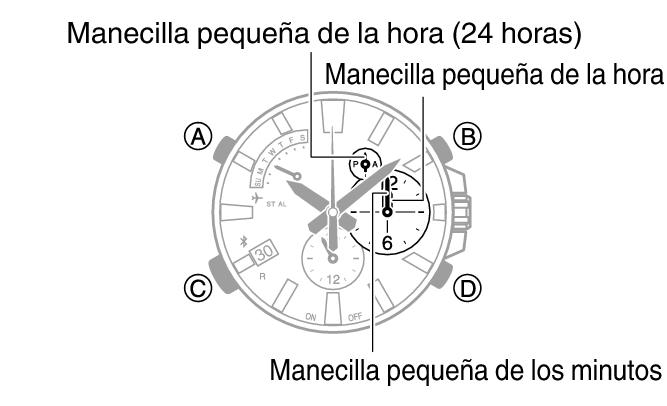 Esto permite ajustar la alineación entre la manecilla de las horas pequeña, el minutero pequeño y la manecilla de 24 horas pequeña.