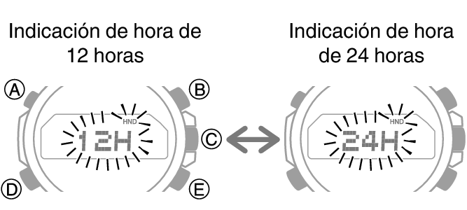 3.Pulse (E) para cambiar el ajuste entre [12H] (indicación de hora de 12 horas) o [24H] (indicación de hora de 24 horas).