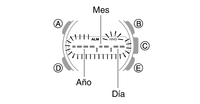 - Utilice la tecla (D) para moverse entre las opciones de configuración (año, mes y día).