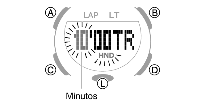 Utilice (B) y (D) para cambiar el ajuste de los minutos.