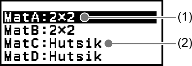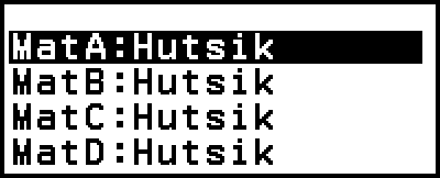 Erabili matrize aldagaien zerrendaren pantaila matrizeak MatA, MatB, MatC edo MatD matrize aldagaietan gorde nahi dituzunean edo aurretik gordetako matrizeak editatu nahi dituzunean. Matrize aldagai bakoitzaren egoera ondorengo adibideetan erakusten den moduan adierazten da.