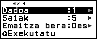 Dadoa botatzea funtzioak bat, bi edo hiru dado birtual botatzen ditu zehaztutako aldi kopuruan. Emaitza eskuratzeko, hautatu pantaila hauetako bat: