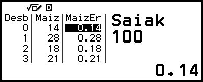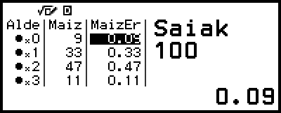 Maizt erlatiboa pantailan, aldagai batean gorde dezakezu MaizEr zutabearen gelaxkako balioa. Adibidez, aipatutako 5. pausoan honako eragiketa hau egiten baduzu, A aldagaian gordeko da “MaizEr” zutabeko lehen errenkadako balioa: