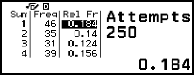 (3) Rel Fr: Näyttää heittojen tulosten suhteellisen frekvenssin (frekvenssi jaettuna heittojen lukumäärällä).