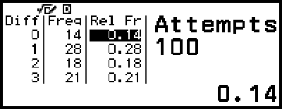 Esimerkki: 100 nopanheittokerran simuloiminen kahdella nopalla. Tässä esimerkissä Relative Freq -näyttöä käytetään simulointituloksiin, joka näyttää esiintymien lukumäärän (frekvenssit) ja numeerisen eron (0, 1, 2, 3, 4, 5) suhteelliset frekvenssit kahden nopan välillä kullakin heitolla.