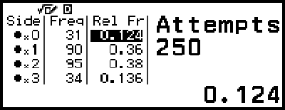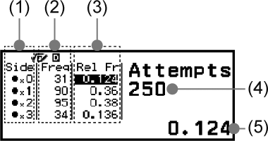 (2) Freq: Näyttää kunkin heiton tuloksen esiintymistiheyden (frekvenssi).