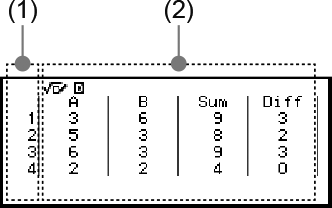 (2) A, B ja C osoittavat kutakin käytettävää noppaa. ”Sum” on lopputuloksen summa ja ”Diff” on kahden nopan tulosten välinen ero. Näytössä näkyvät sarakkeet riippuvat siitä, kuinka monta noppaa on käytössä.