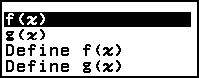 lorsque l’écran d’enregistrement de l’équation g(x) est affiché donne seulement lieu à l’affichage de l’élément de menu [f(x)]. De la même manière, si vous appuyez sur
