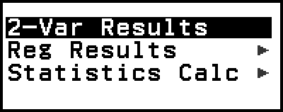 Sélectionnez [1-Var Results], [2-Var Results] ou [Reg Results] pour voir une liste de résultats de calcul qui reposent sur les données que vous avez entrées. Pour plus de détails, consultez « Affichage des résultats de calcul statistique ».