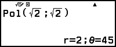 Exemple 1 : Pour convertir des coordonnées rectangulaires (√2; √2) en coordonnées polaires (Saisie/Résultat : Smaths/Rmaths, Unité d’angle : Degré)