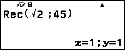 Exemple 2 : Pour convertir des coordonnées polaires (√2; 45°) en coordonnées rectangulaires (Saisie/Résultat : Smaths/Rmaths, Unité d’angle : Degré)