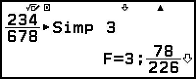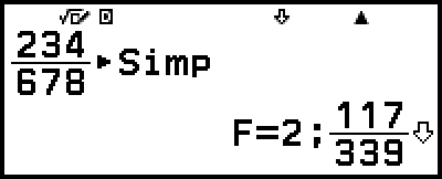 Simp immédiatement après une fraction, comme indiqué ici, permet d’afficher le résultat du calcul sous forme d’une fraction, quel que soit le réglage Saisie/Résultat actuel. En outre, appuyer sur