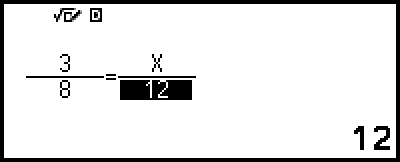 Ici, nous souhaitons résoudre 3 / 8 = X / 12 pour X, sélectionnez [A/B=X/D], puis appuyez sur