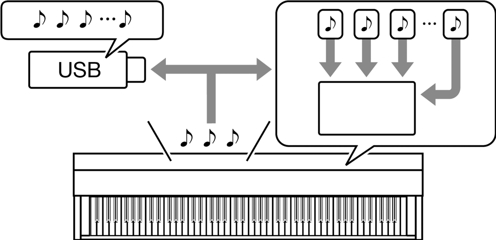 Les performances sont converties en données MIDI et enregistrées sur deux pistes (domaine des données où les performances sont enregistrées) dans la mémoire interne.