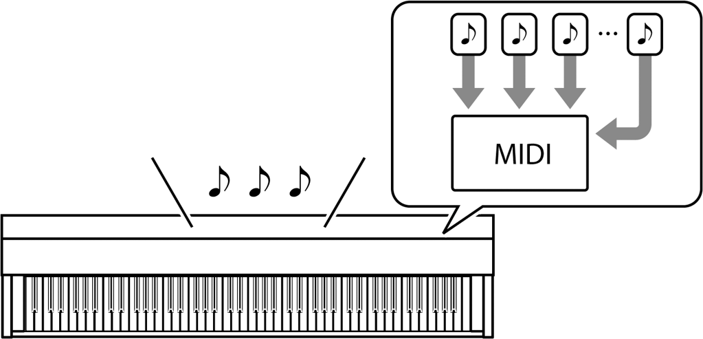MIDI est une abréviation de « Musical Instrument Digital Interface ». Il s’agit d’une norme unifiée qui permet d’échanger des informations sur les performances (touches enfoncées et relâchées, force du toucher, etc.) entre des instruments de musique électroniques ou entre des instruments de musique électroniques et du matériel informatique, quel que soit le fabricant. Les informations de performance échangées sont appelées données MIDI.