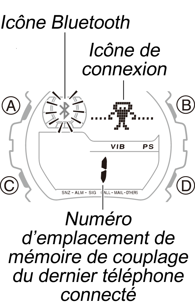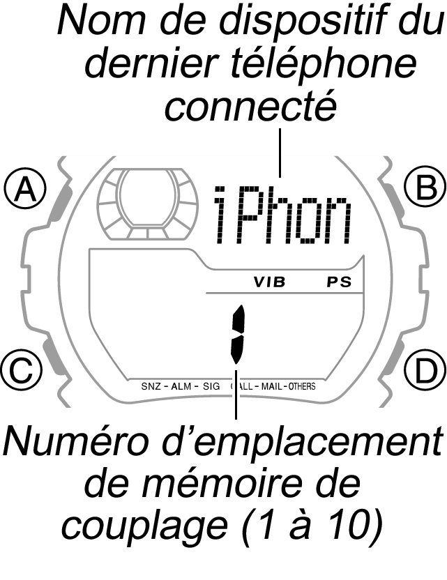 - Appuyez sur le bouton D pour afficher le numéro d'emplacement de mémoire de couplage du téléphone auquel vous n'êtes pas parvenu à reconnecter la montre.