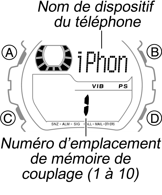 - Utilisez le bouton D de la montre pour faire défiler les emplacements de mémoire de couplage jusqu'à ce que celui du téléphone auquel vous souhaitez connecter la montre s'affiche.