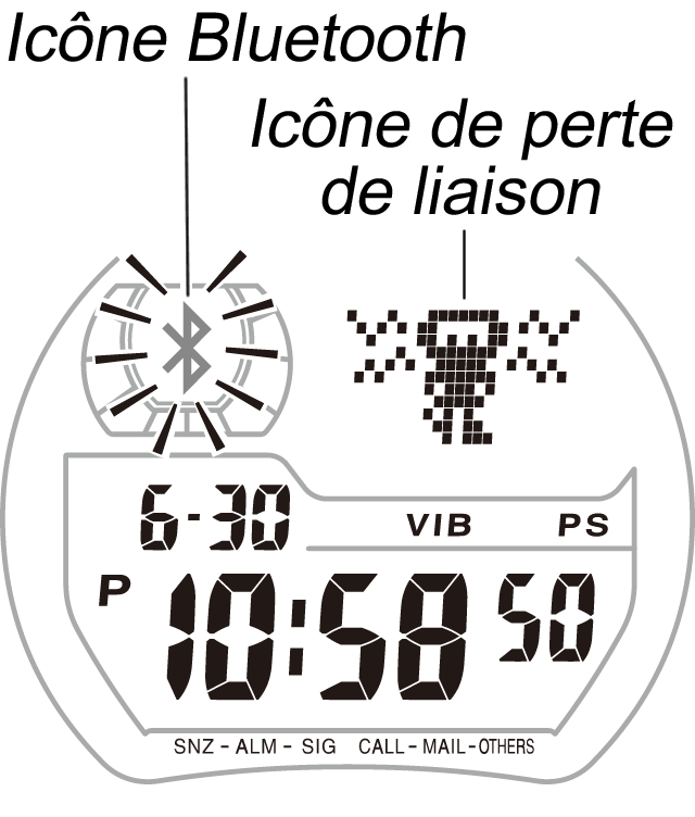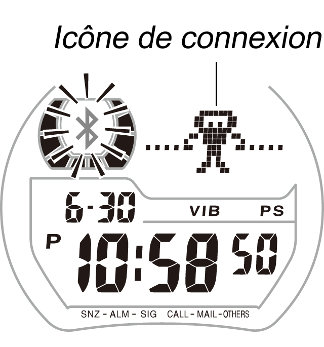 - La montre tente de se reconnecter automatiquement une fois par minute. À chaque tentative de reconnexion, l'icône Bluetooth clignote sur l'écran de la montre et l'icône de connexion s'affiche. En cas de réussite de la reconnexion, la montre repasse en mode Montre avec l'icône Bluetooth affichée. En cas d'échec de la reconnexion, la montre repasse en mode Montre sans icône Bluetooth affichée.