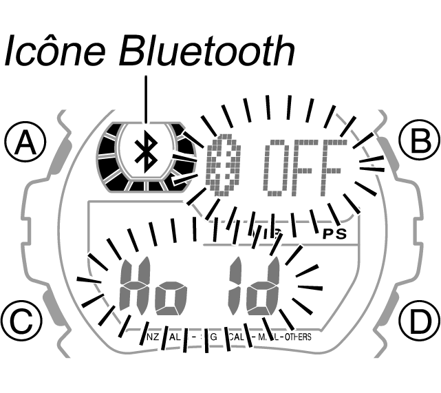- En mode Montre, maintenez enfoncé le bouton B pendant environ deux secondes jusqu'à ce que l'icône Bluetooth disparaisse de l'écran.