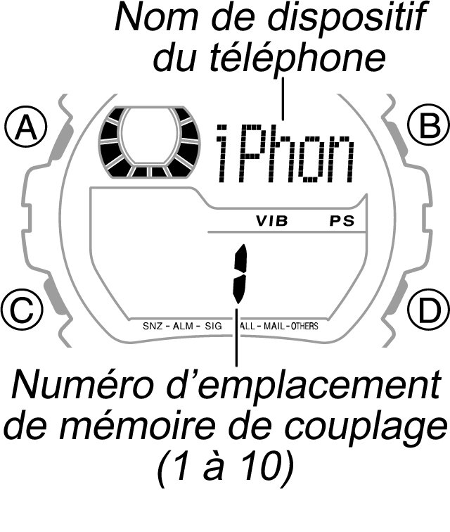 Si vous relâchez le bouton B alors que l'écran de confirmation de découplage intégral est affiché (avant que l'écran de nom de dispositif de la montre ne s'affiche), l'opération de découplage de tous les téléphones s'annule. Dans ce cas, les informations de couplage du numéro d'emplacement de mémoire de couplage affichées avant que vous n'appuyiez sur le bouton B sont supprimées. - L'affichage fait défiler les écrans, comme indiqué ci-après.