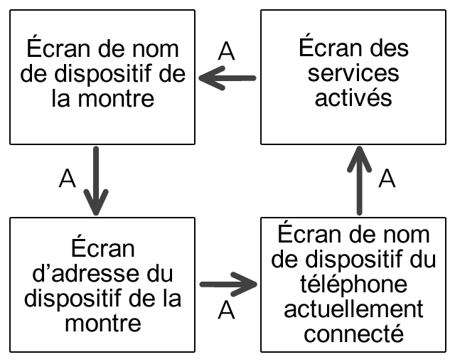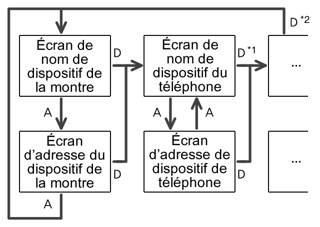 *2 Une pression sur le bouton D après que les écrans de nom de dispositif de l'ensemble des téléphones couplés se sont affichés permet de revenir à l'écran de nom de dispositif de la montre.