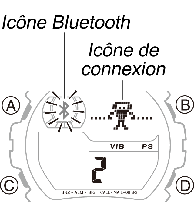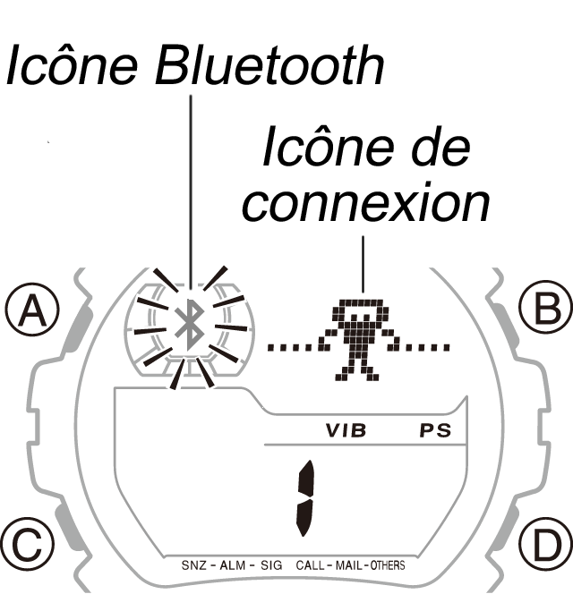 - Si l'icône Bluetooth s'affiche sur la montre, passez en mode Montre, puis maintenez le bouton B enfoncé pendant environ deux secondes jusqu'à ce que l'icône disparaisse.